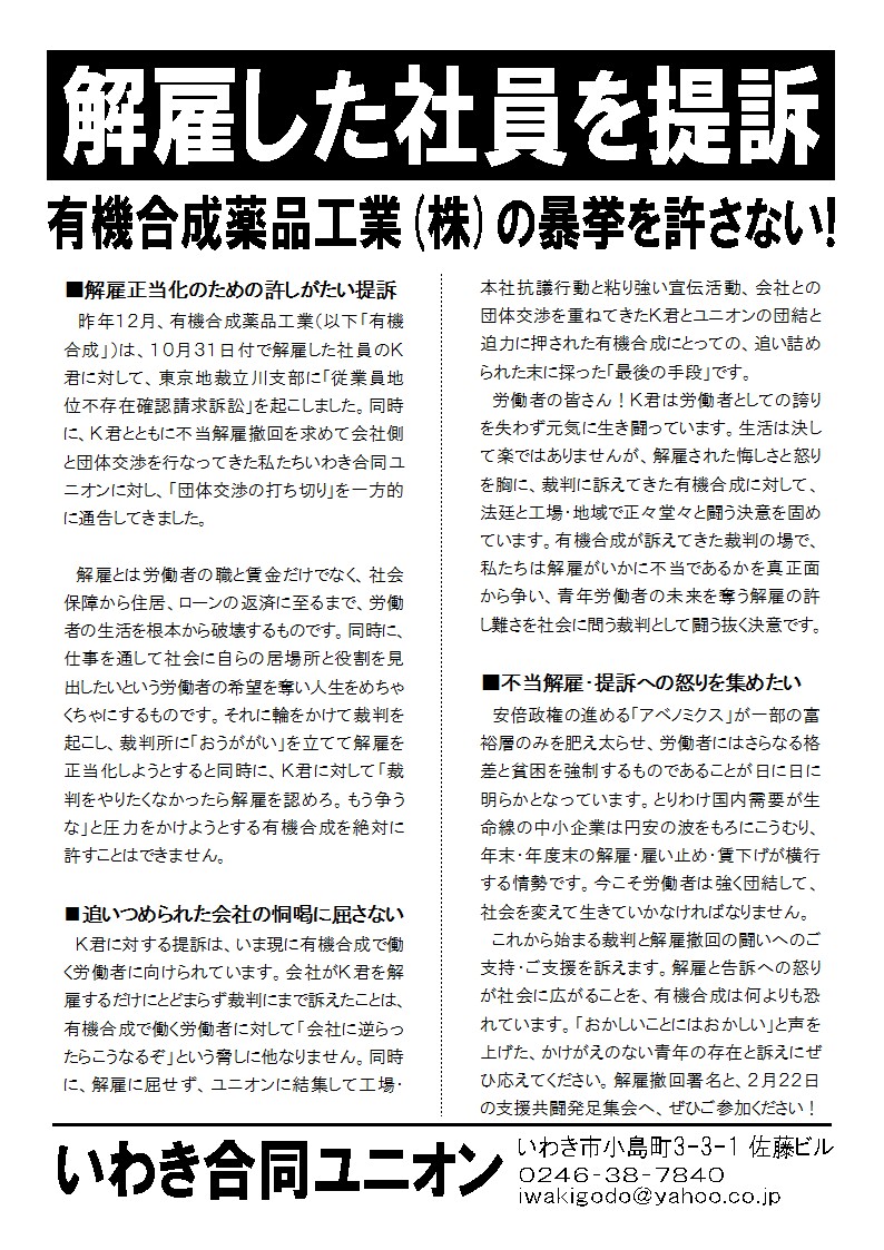 昨年12月、有機合成薬品工業(以下「有機合成」)は、10月31日付で解雇した社員のK君に対して、東京地裁立川支部に「従業員地位不存在確認請求訴訟」を起こしました。同時に、K君とともに不当解雇撤回を求めて会社側と団体交渉を行なってきた私たちいわき合同ユニオンに対し、「団体交渉の打ち切り」を一方的に通告してきました。
